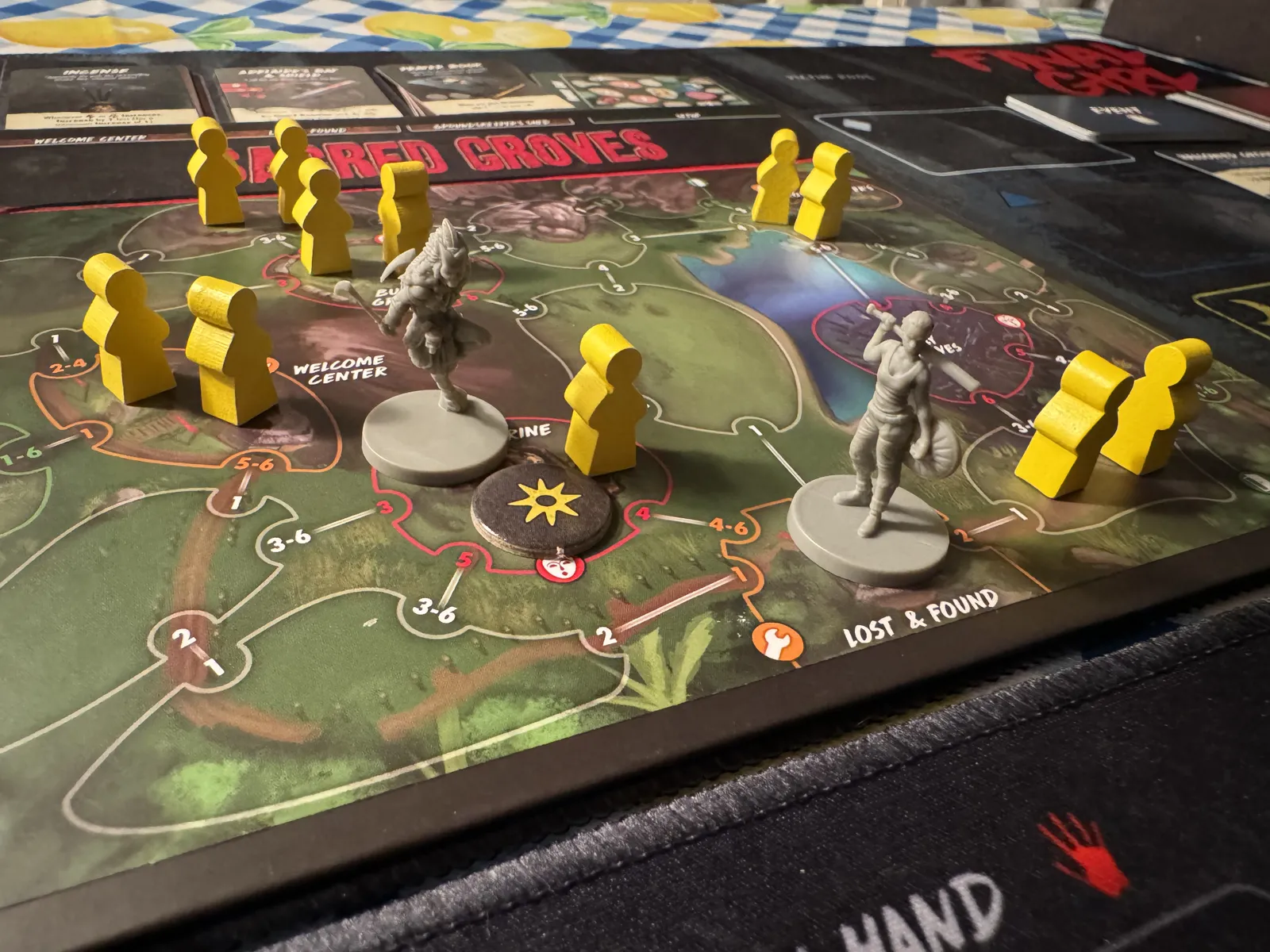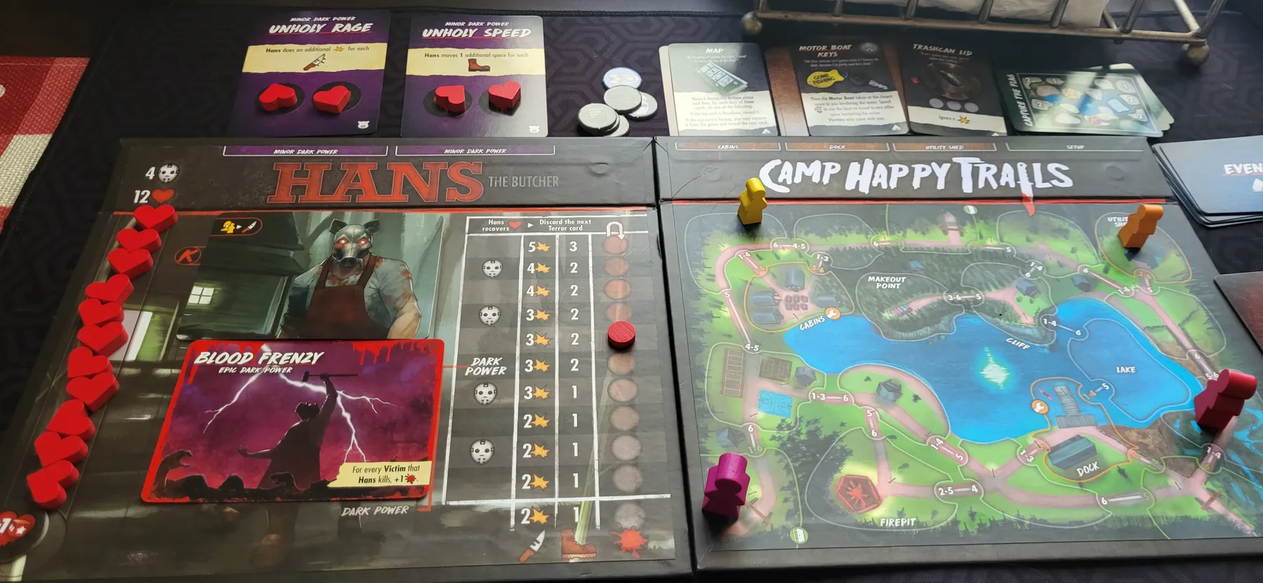 殺人鬼のムーブが雰囲気あるんだよなぁ。距離と間の取り合いがまさに死闘。イーオンズエンドやデスメイダイとくらべれば、このことがよくわかる。どれも好きなボードゲームだけど、また一つやり込み作品に出会ってしまった(^^) pic.twitter.com/eyFke65Fw5
