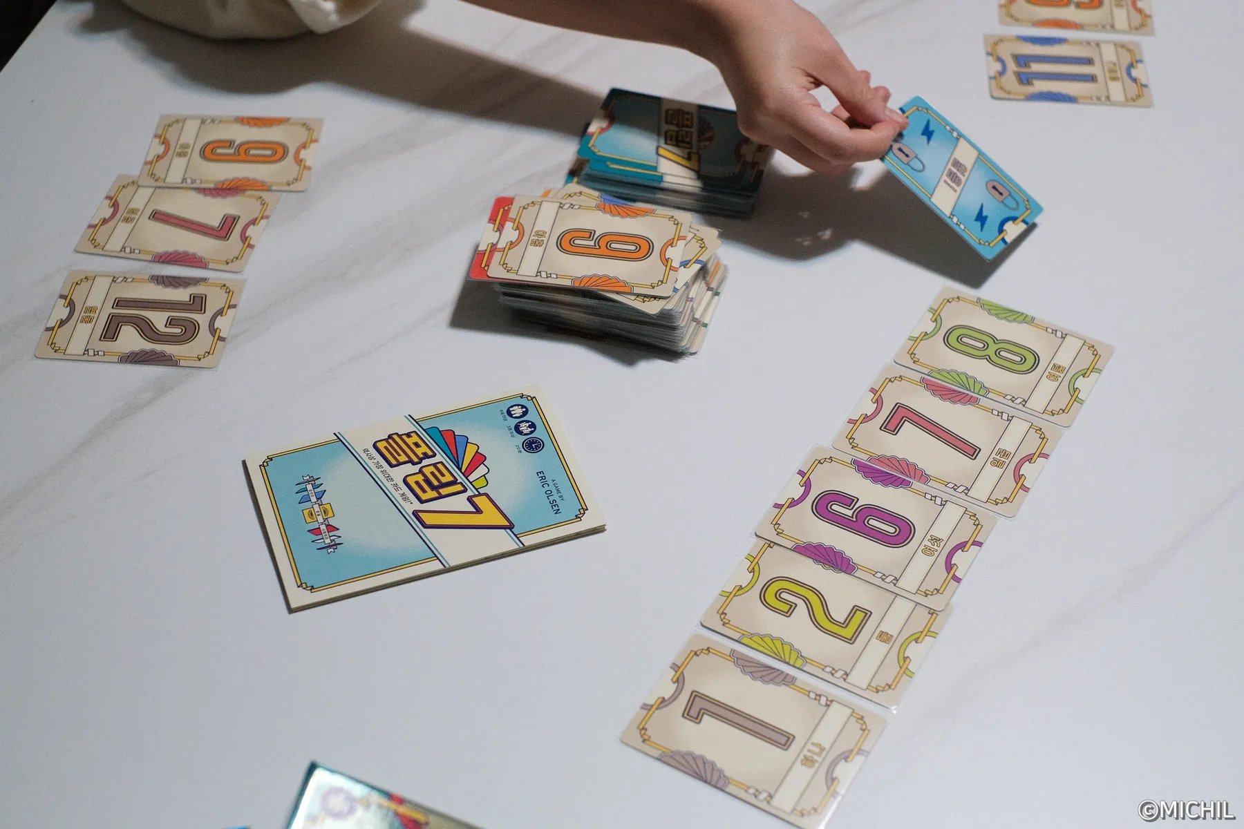 7種類の数字が揃えばボーナス得点。効果カードもあり、得点高い人を止められたり3枚連続で引かせたり。とても盛り上がるしやっぱり面白い😊#ゲームマーケット2025秋 pic.twitter.com/VEeVdL0KRO