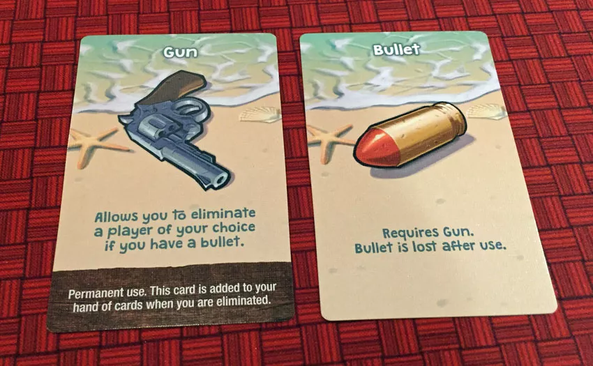 「拳銃」と「弾丸」のカードをセットで持っていると、好きなプレイヤーを脱落させることもできる。