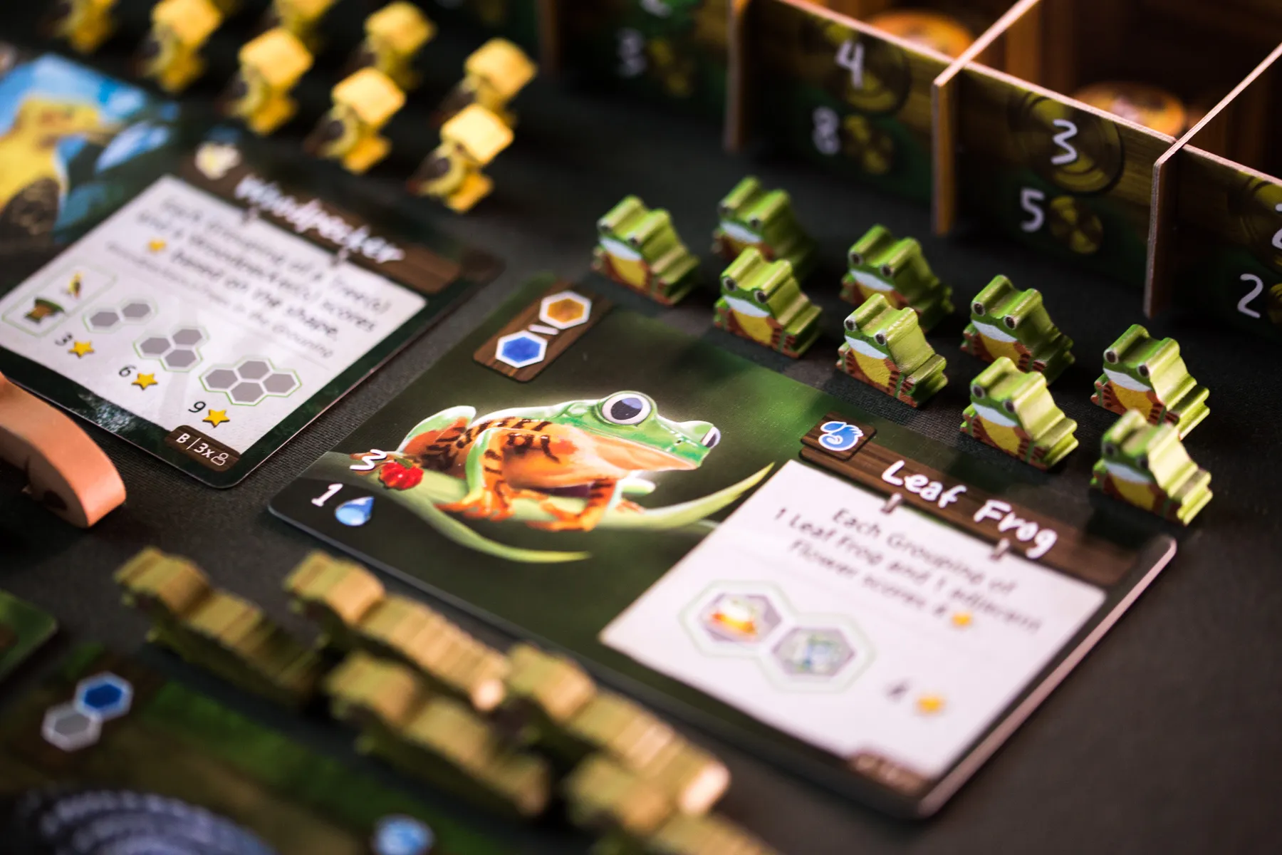 相棒動物の特殊能力を使いながら、バックの中身を改善して、ジャングルを広げたり、動物や植物を配置したり、即時効果の昆虫カードや個人目標の風景カードを買ったりして自分だけのジャングルを作る