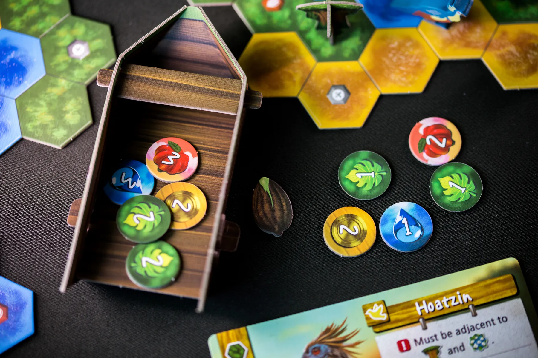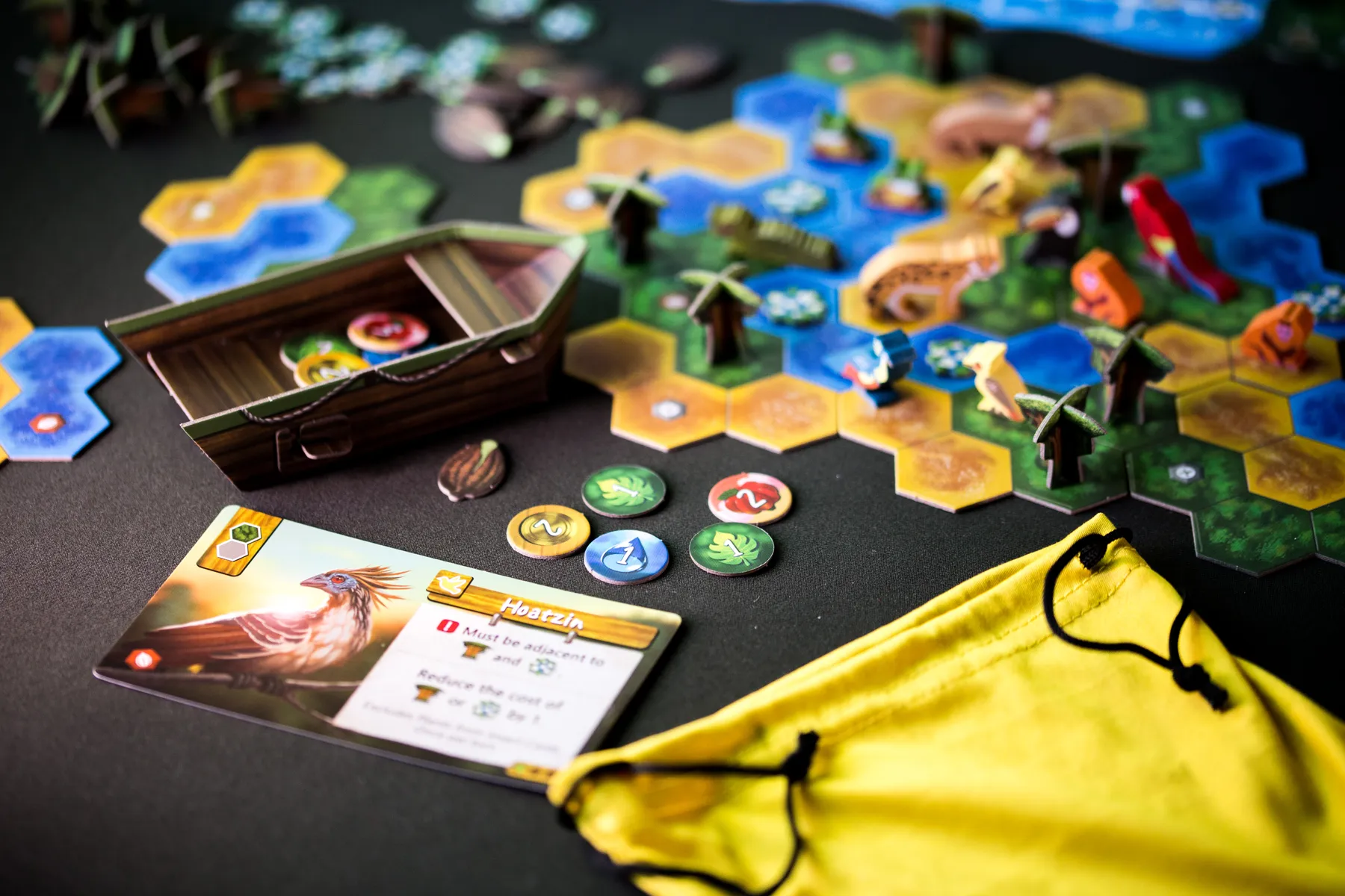 自分だけのジャングルを育て上げ、「環境スコア」(勝利点)が最も高いプレイヤーが勝者となる。 - 手番では、自分の布袋から引かれた”5枚の資源トークン”を支払いに使って、「地形タイル配置」「動物配置」「トークン購入」などのアクションを実行する。