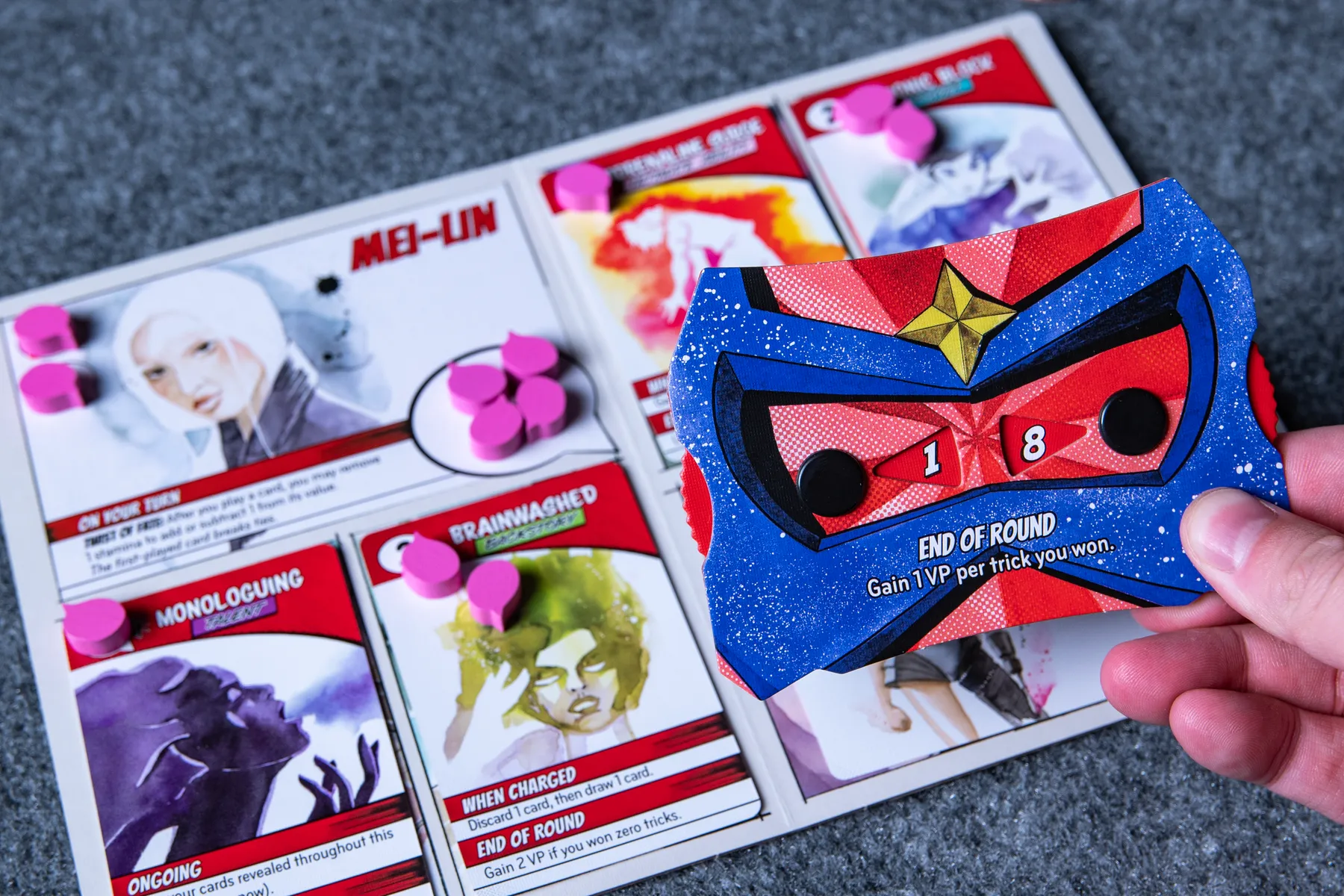 毎ラウンド「ヒーロー(多く勝つ)」or「ヴィラン(全敗狙い)」を選択して、その達成度により勝利点を獲得。最終的に最も勝利点の高いプレイヤーが勝者となる。 - トリックテイキングは毎回8枚の手札が配られて、全8トリック行う。