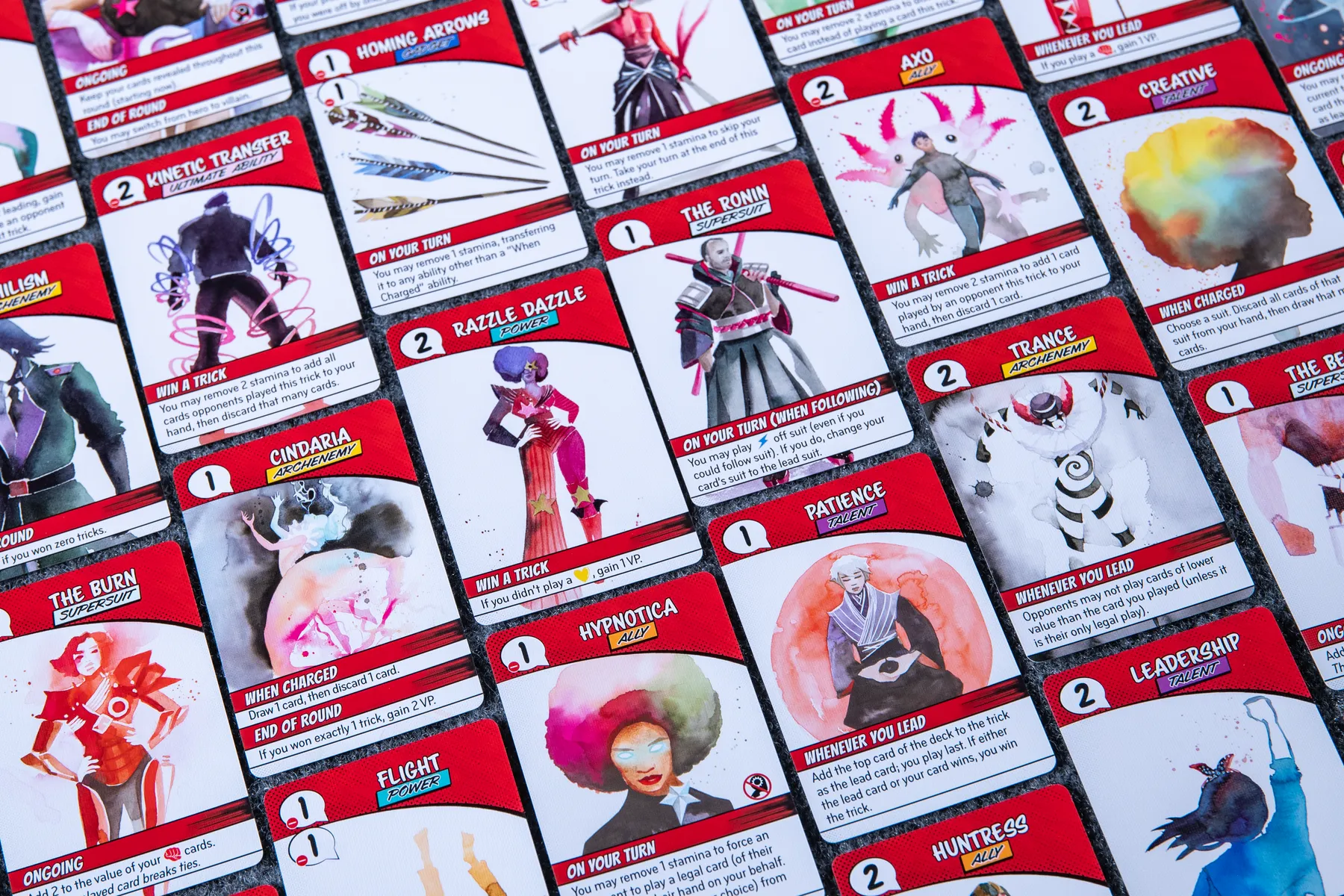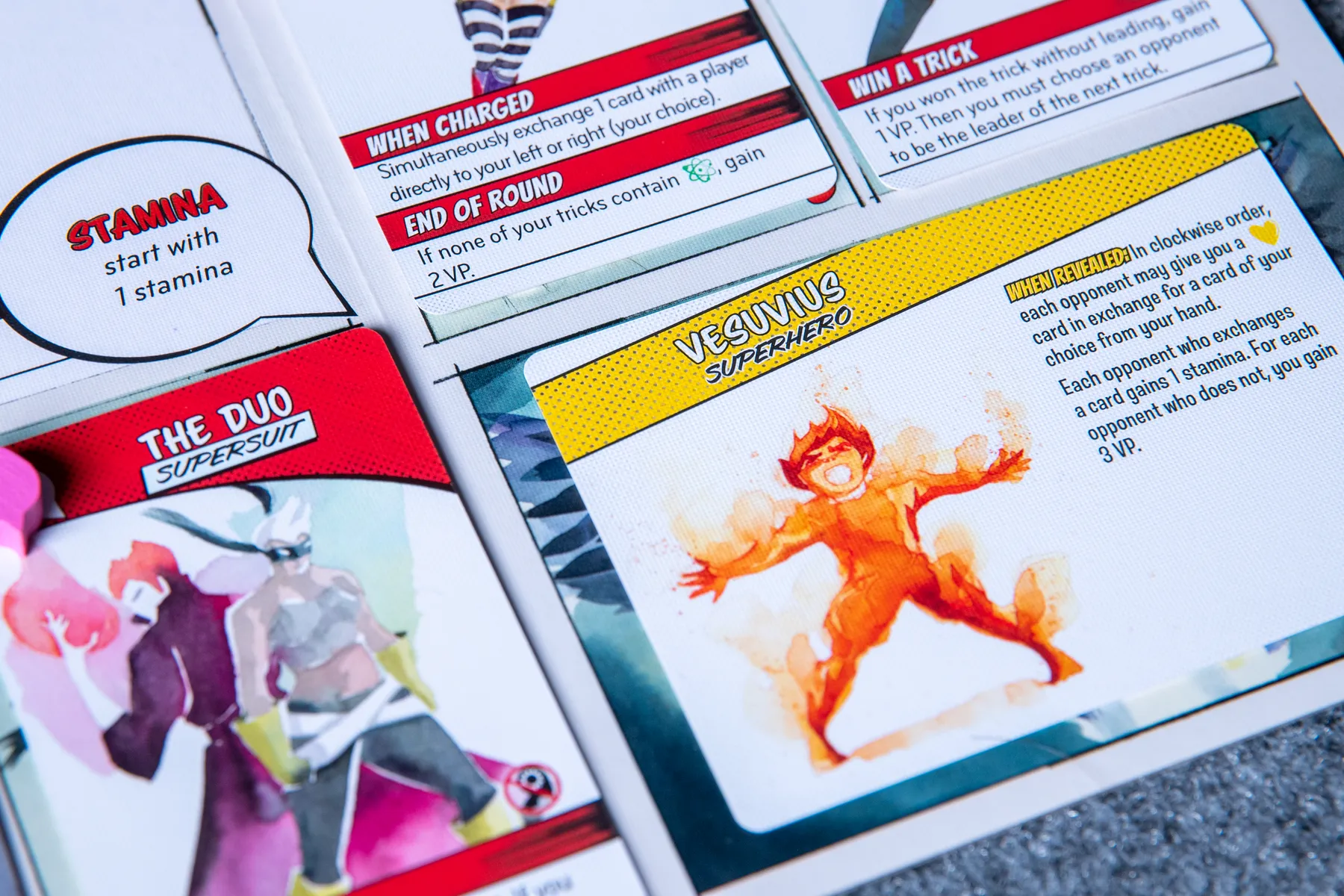 ラウンド開始時にスタミナを使ってチャージすることで「トリック時に相手が出したカードを獲得する」などの効果を発動できる。 - ゲーム開始時に「スーパーヒーロー」カードがランダムに各自2枚配られ、自分だけ確認。